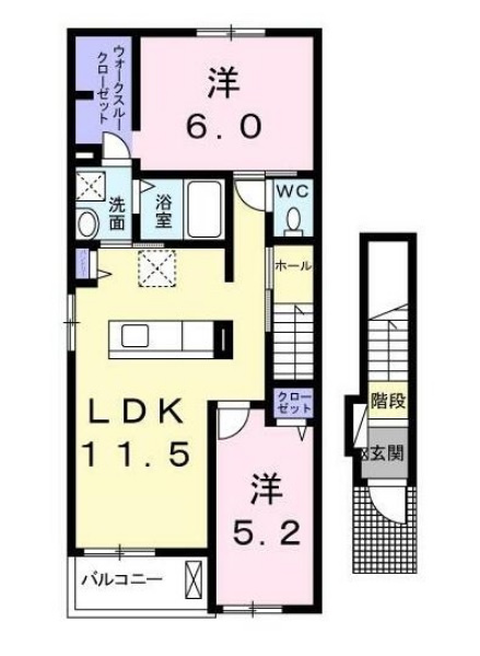 間取りは洋室6帖と5,2帖、LDK11,5帖の2LDK
