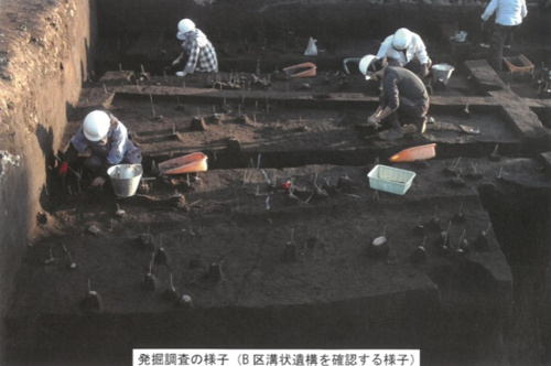 今回の調査では遺構の西側しか確認できていませんが、断面形状が逆台形で底辺ふが平坦であることが共通していて、北側のA区では似たような遺構が確認されないことから、同一の遺構である可能性が高いと考えられるそうです。