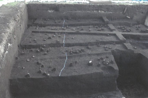 B区の東端において溝状遺構が確認されました。4次調査で発見された溝状遺構は9世紀後半から10世紀頃と考えられており、今回発見された溝状遺構も近い時期の可能性があります。