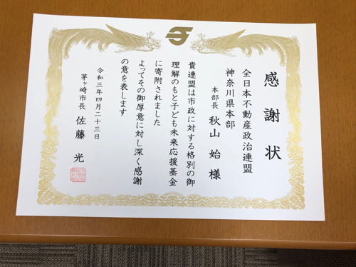 茅ヶ崎市の未来応援基金に寄付したことに対して、茅ヶ崎市長佐藤光様より