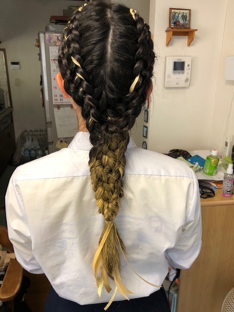 黄色組だった娘さん。朝から美容院で編んでもらい、スプレーで金色にしたそうです。
