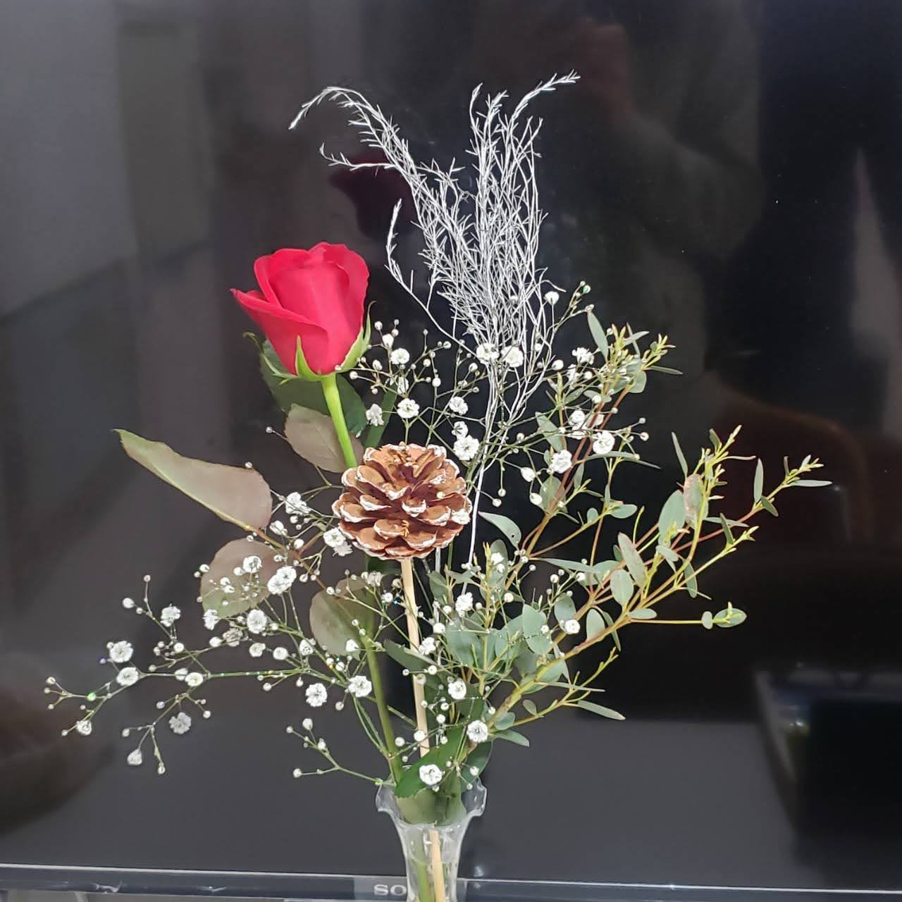 クリスマスが近いこともあってか、赤いバラと松ぼっくりと